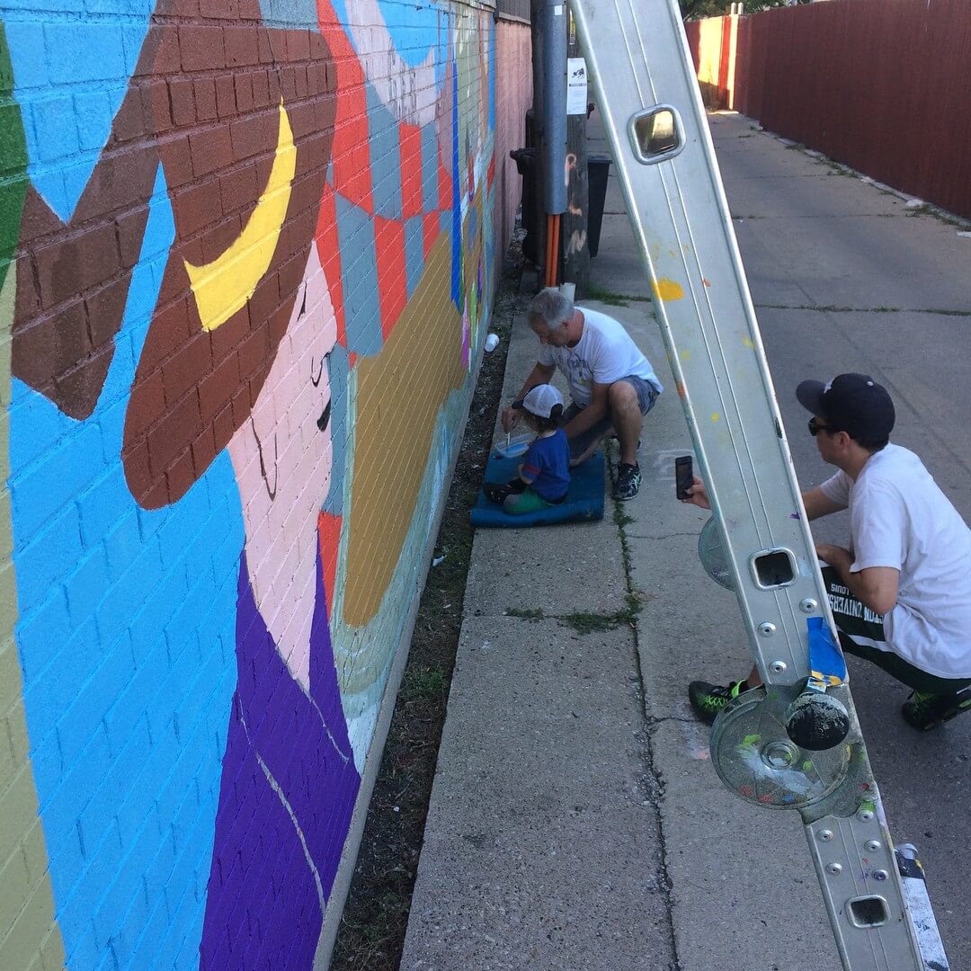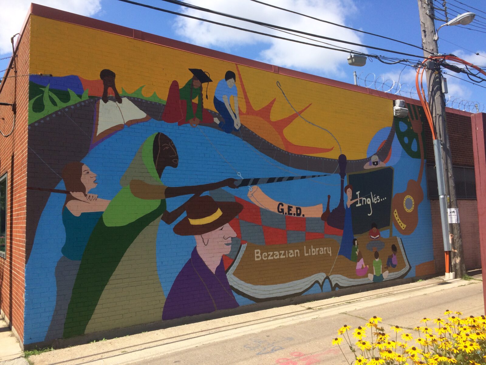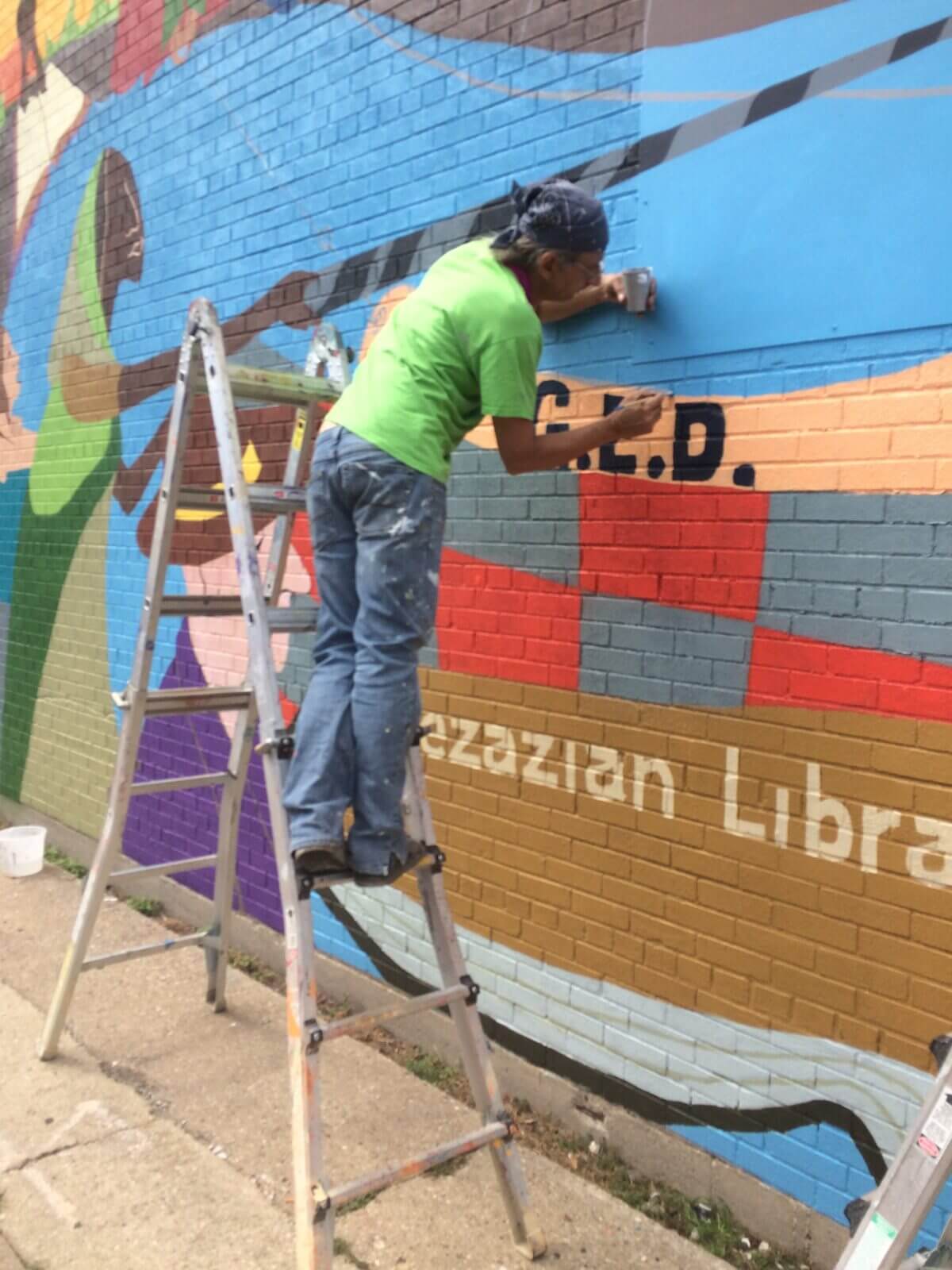 The first painted mural on a Chicago Public Library was almost lost to sun, wind, rain and age. Thanks to the Bezazian Library leadership this historic mural was revitalized. Originally painted with old house paint when colors were limited, the new look flashes a more sparkly smile with rich blues and sharp reds. Enjoy another 40 years!