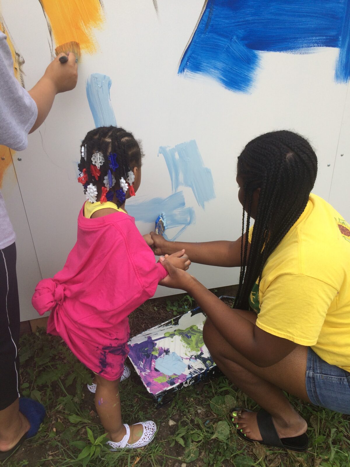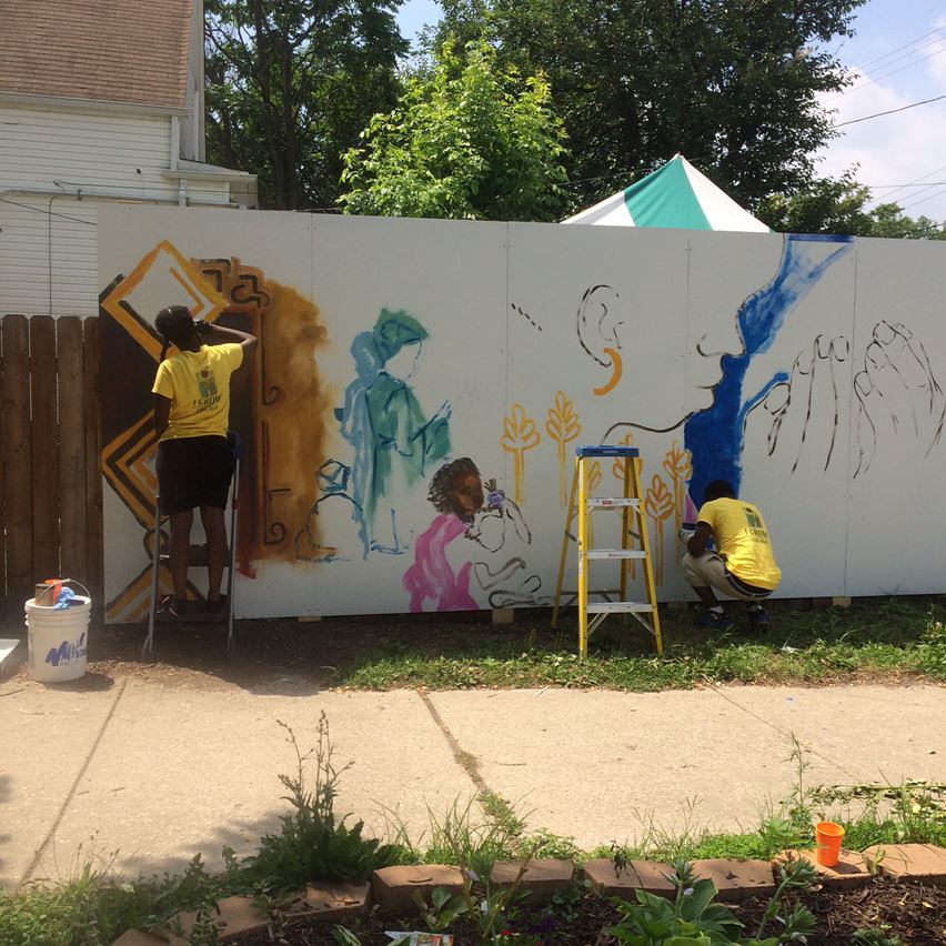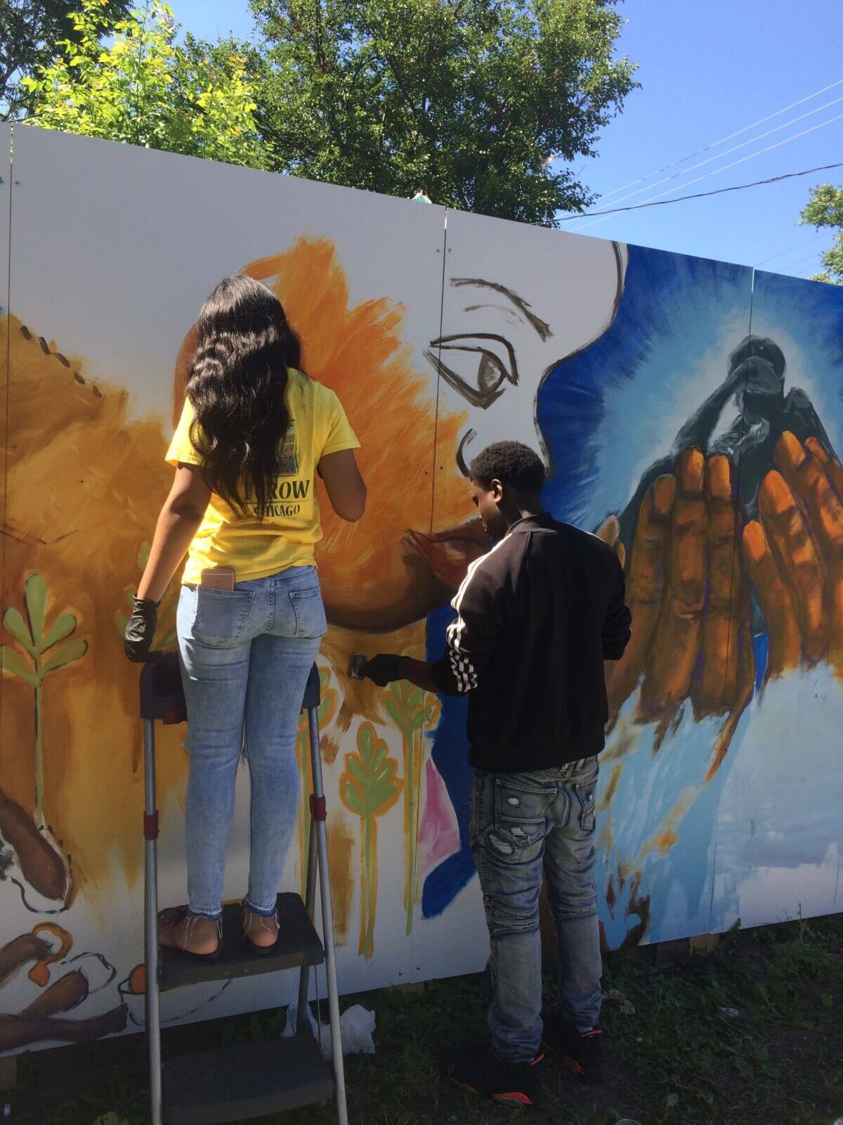 Working with the remarkable adults and campers at I Grow Chicago in Englewood, Cyd Smillie paints her mural “What We Create” to honor women and all they do. This mural was inspired by the women’s march earlier this year and features images of many of the neighborhood’s women and girls.