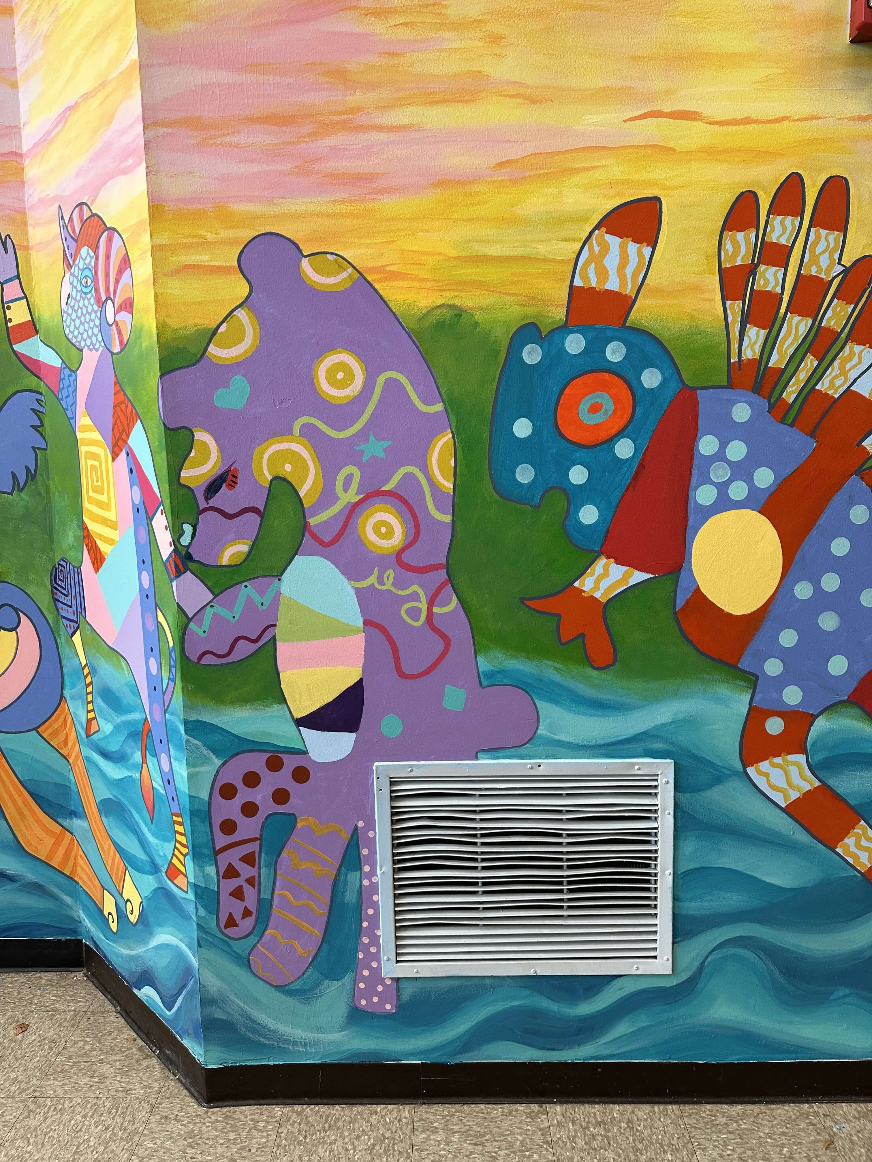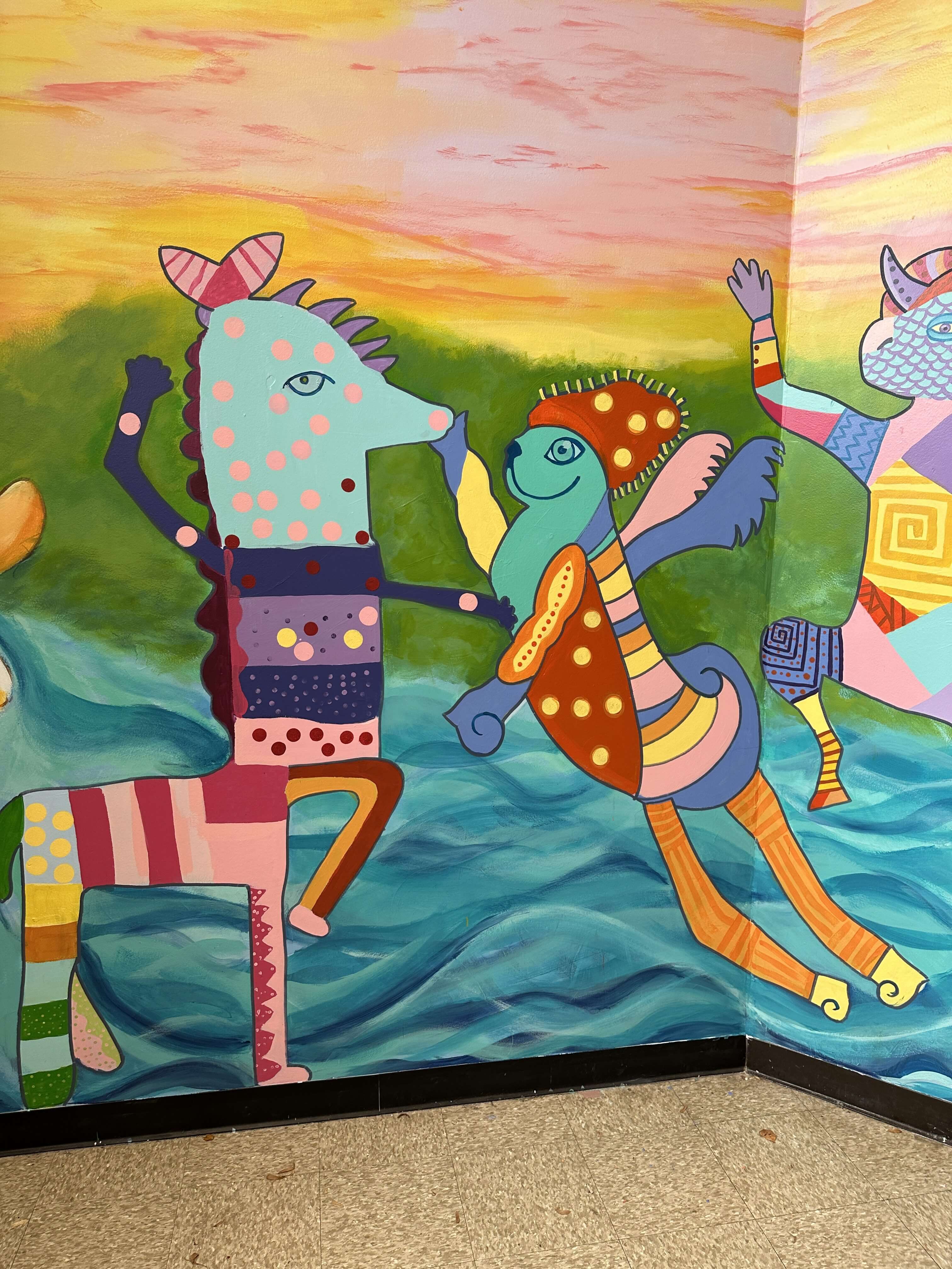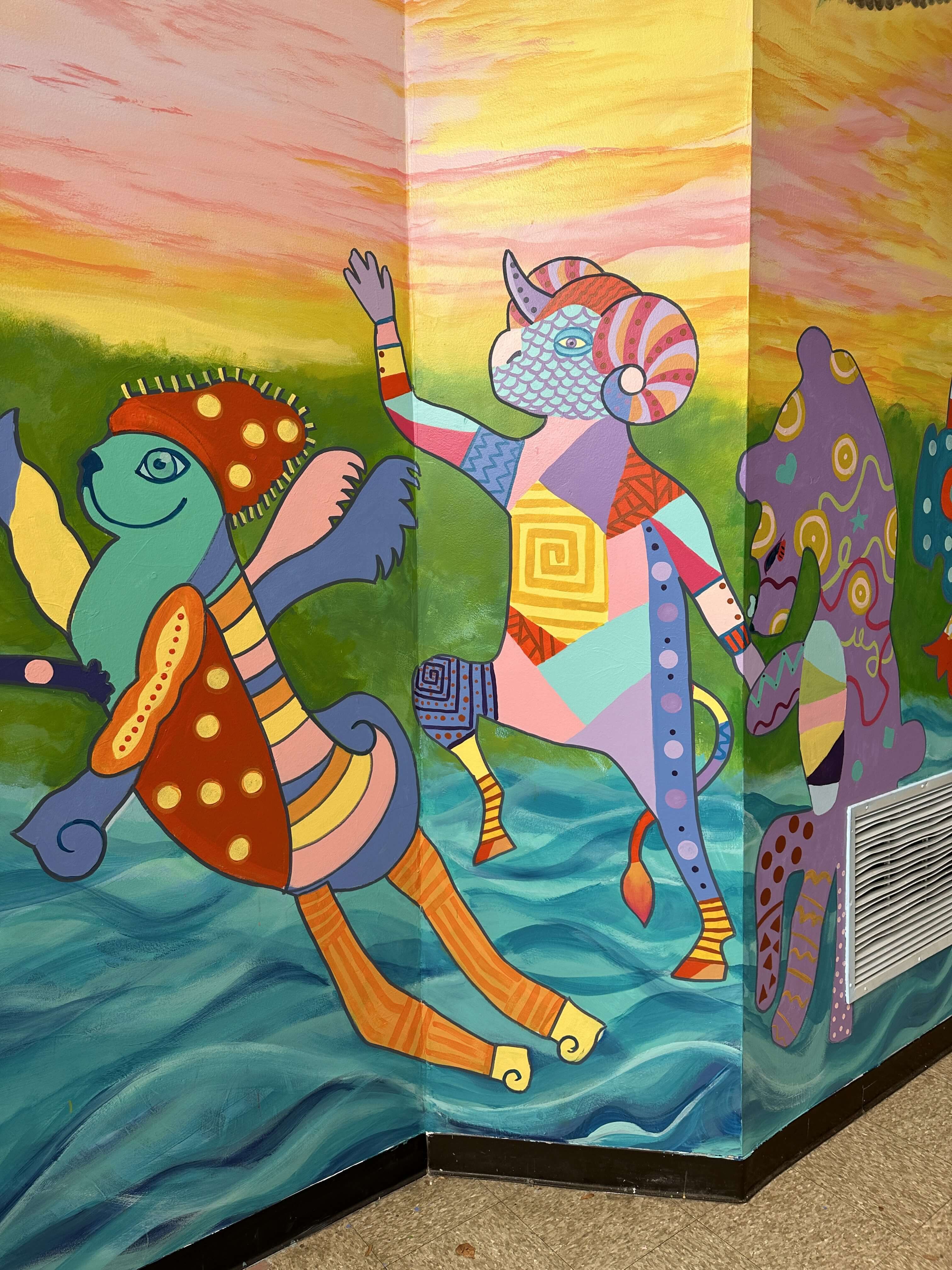 Colorful mural of whimsical animals dancing by the water.