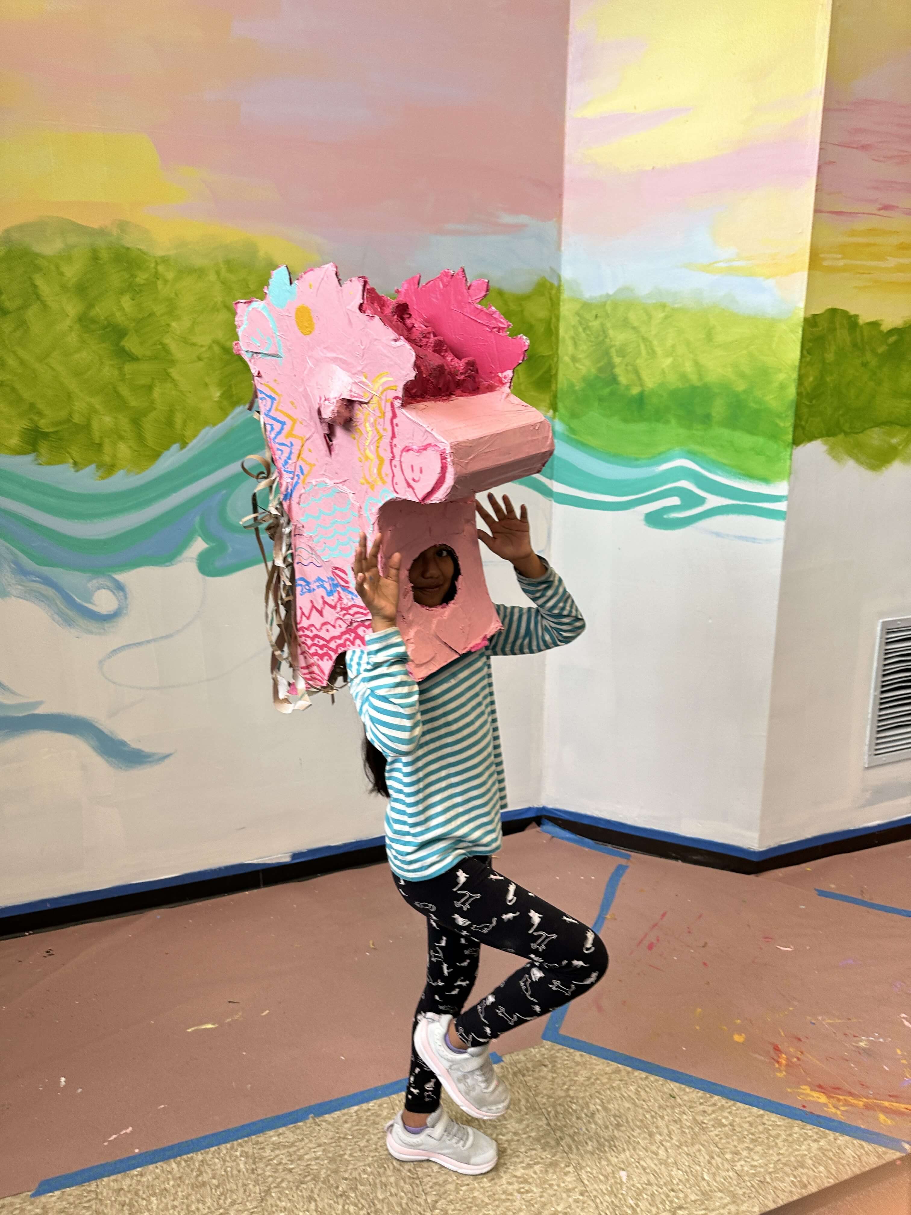 Children wearing handmade animal masks stand in front of colorful murals indoors.