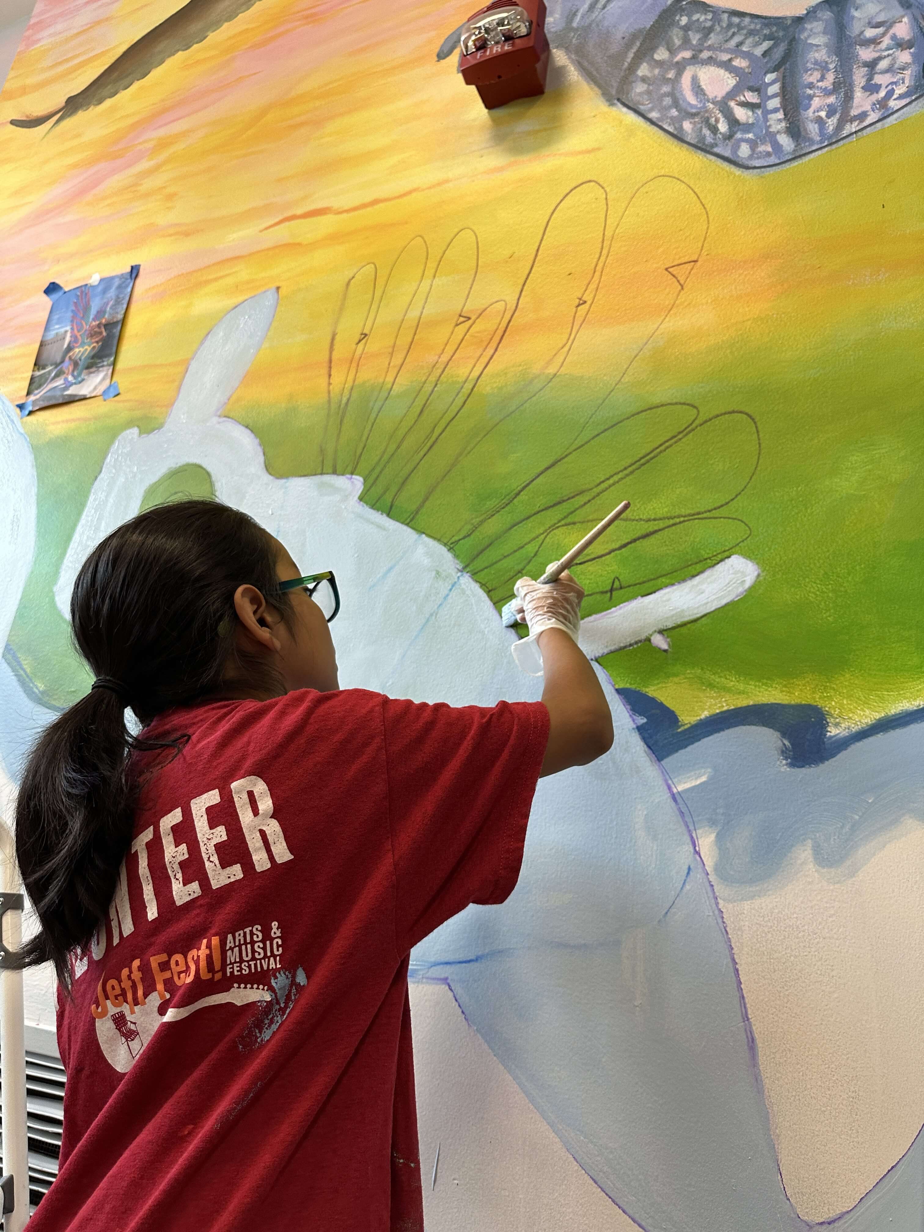 A volunteer painting a mural with a white rabbit on a colorful background.