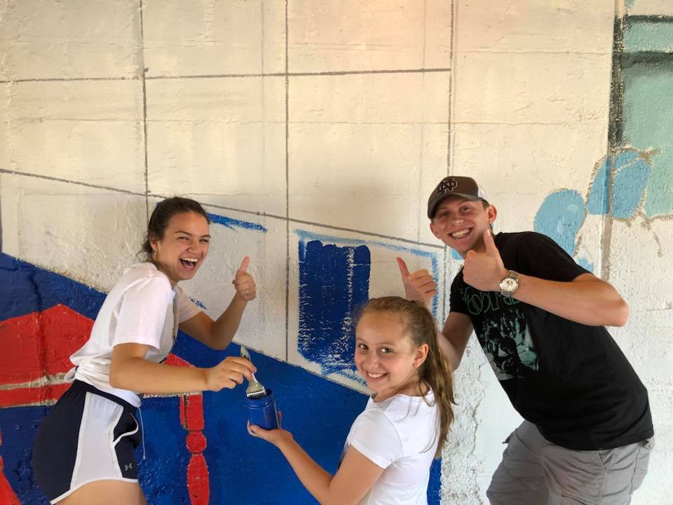 This week the amazing crew of outstanding interns, diligent local artists and drop in volunteers completed the first of two murals designed by Cyd Smillie honoring Veterans. 11th ward Alderman Patrick Thompson and his crackerjack staff organized two community paint days with over 150 volunteers and students from 3 area schools to prime and paint the walls for this DCASE YOPA project. Weeks of dedication by artists and interns meant developed images and details to be enjoyed by pedestrians, highlighted by the detailed drawings of military and veteran logos on each column individually created by a high-school student for the motorists point of view.