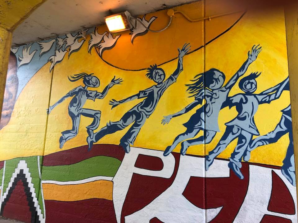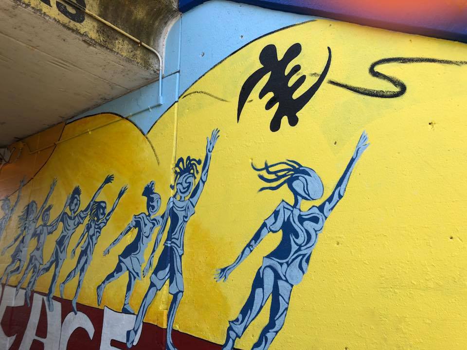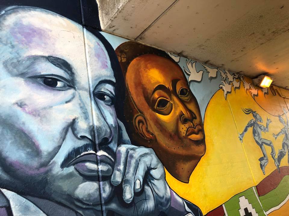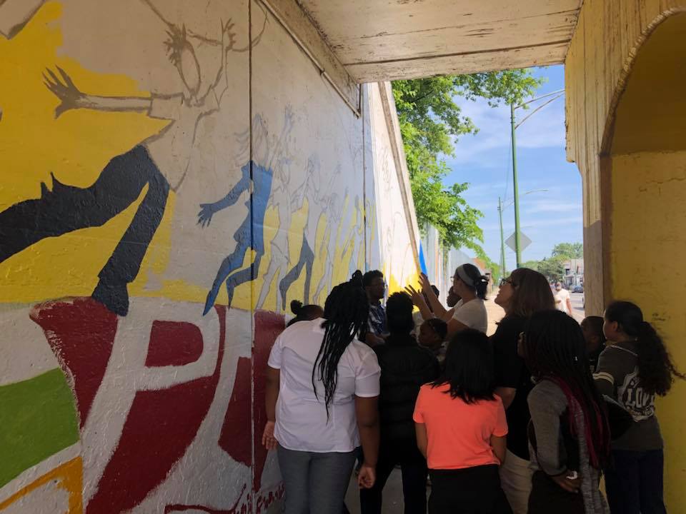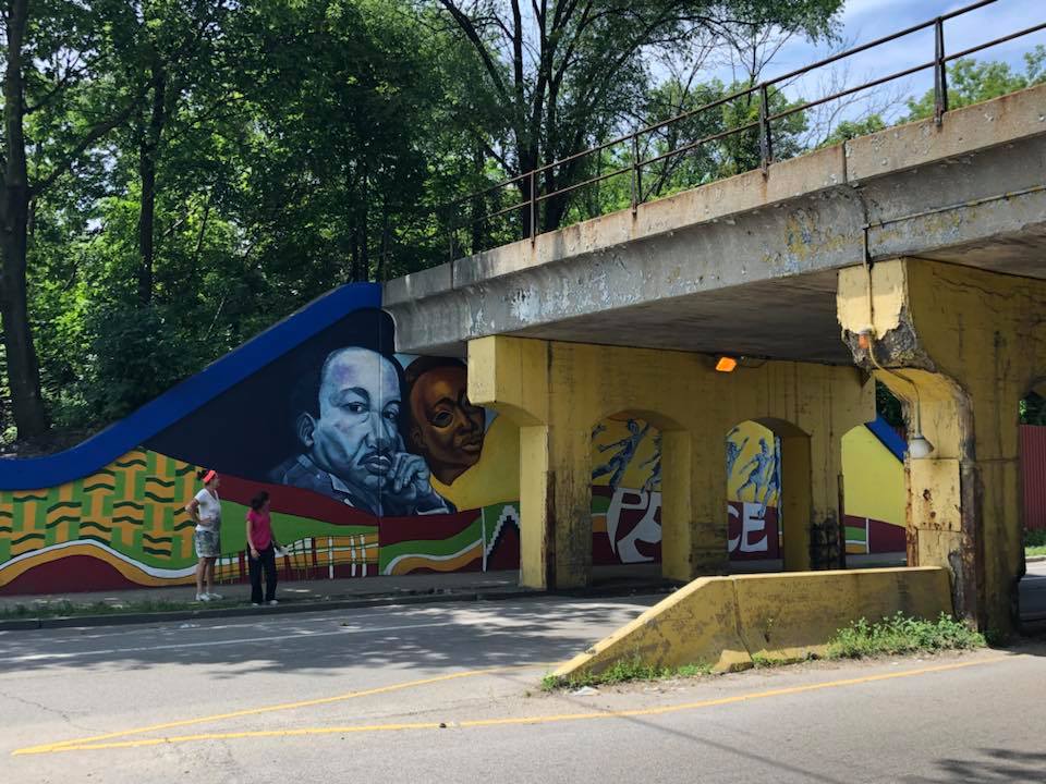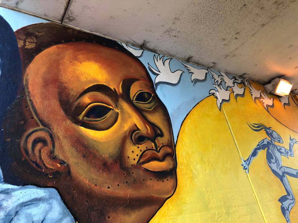 “King of Peace” mural designed by Henderson art teacher Darrell Pulliam was completed June 29,2018 with the help of interns Lindsey Grace, Wil D, Zoe P. Ewa M. and AAC perennial volunteers Linda Vidmar and Dan Pogorzelski. Brian and Tyler, borrowed from I Grow Chicago’s Peace House picked up rollers and brushes to clean up adjacent fencing and help seal both murals at this location. All-in-all a terrific team to launch the 2018 mural season and complete this DCASE YOPA 2017 project.