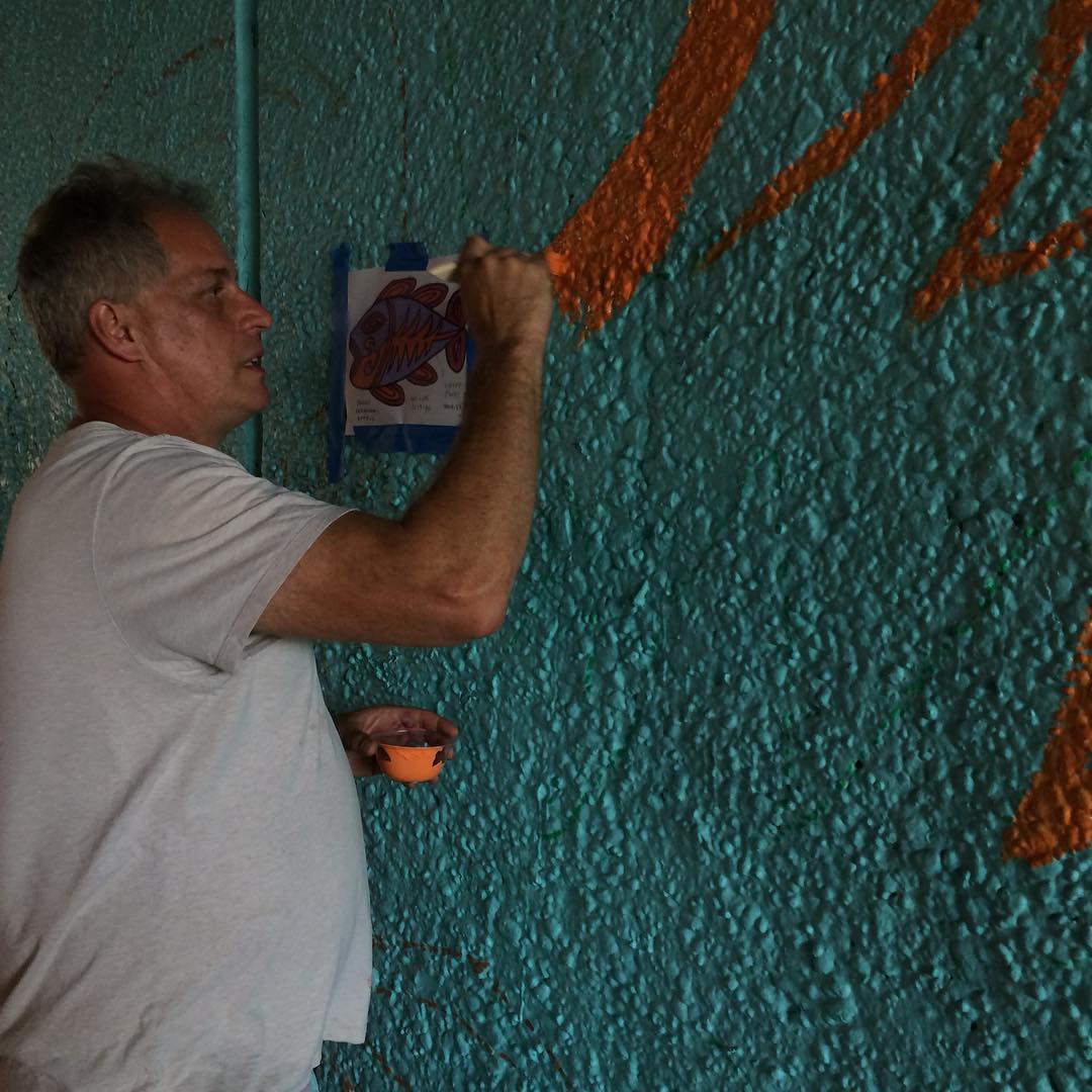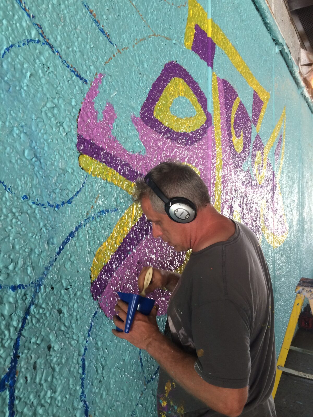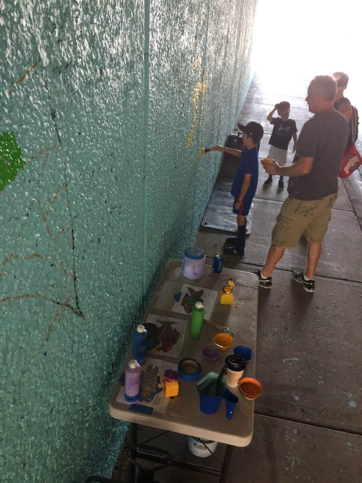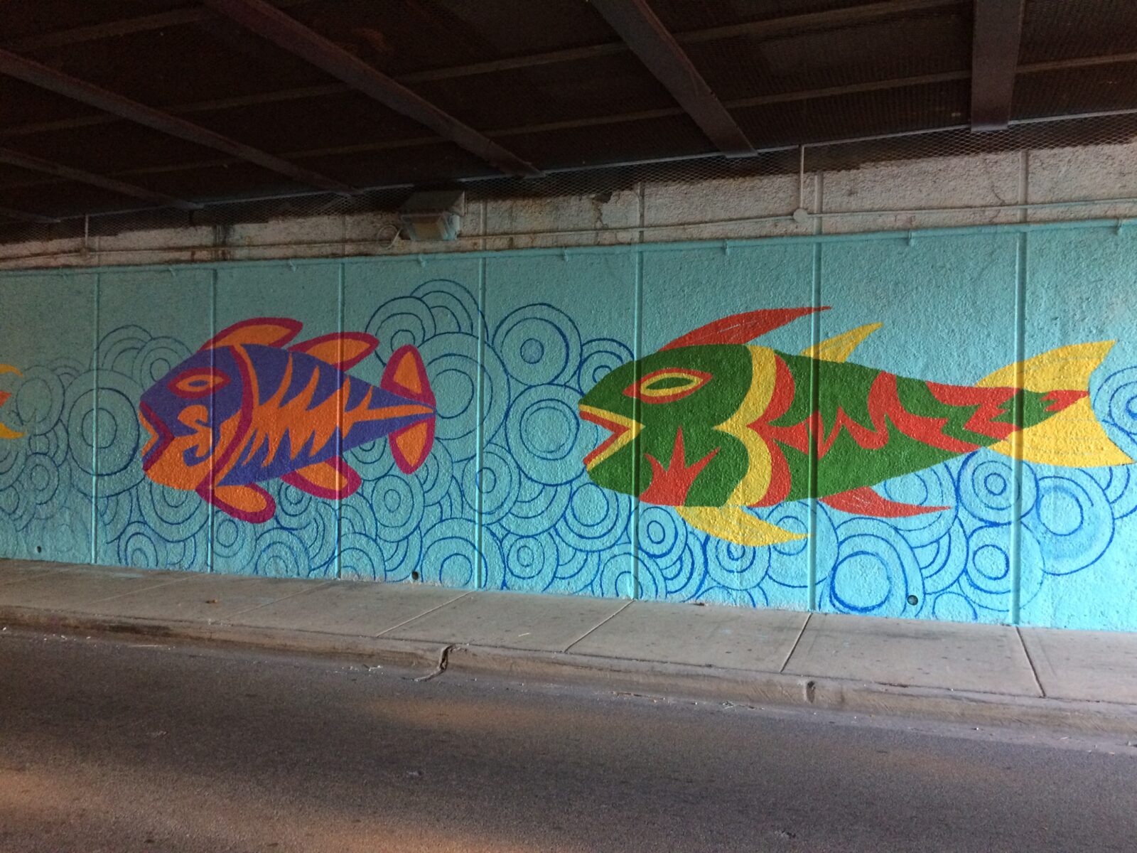 Arts Alive Chicago’s artist Tony Passero designed a joyous mural for a lakefront underpass. Cyd Smillie helped to paint. The project was privately funded and approved by Alderman Cappleman.