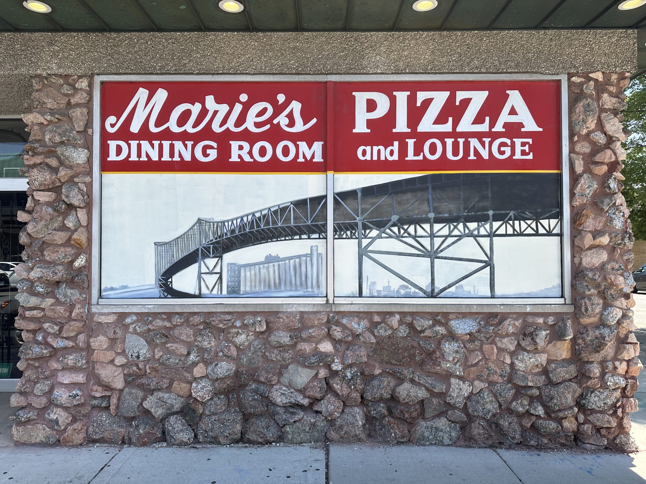 In 2024 The Art Institute of Chicago asked artists across the City to design windows highlighting the work of their featured artist, Georgia O’Keefe. The Pulaski Elston Business Association (PEBA) contacted one of our artists to paint the 75′ of windows for the closed Marie’s Pizza and Liquors. With Ms. O’Keefe’s city paintings as inspiration, Chicago Henge took the center panel in the piece “City in a Garden